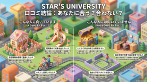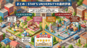 こうした点を理解した上で入会すれば、トラブルを回避しやすくなります。では最後に、STAR’S UNIVERSITYの総合評価をまとめます。